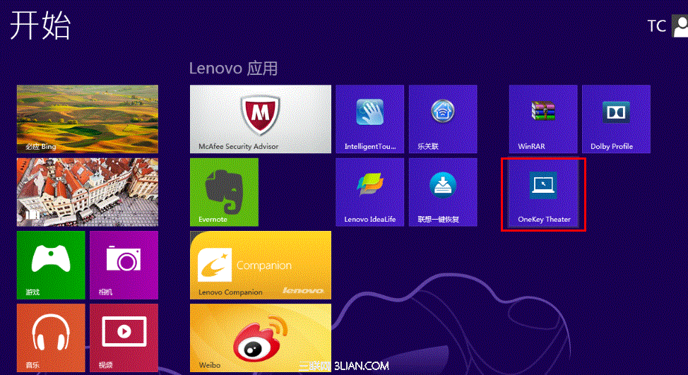 Metro開始菜單中點擊一下‘OneKey Theater’圖標即可恢復,如下圖: