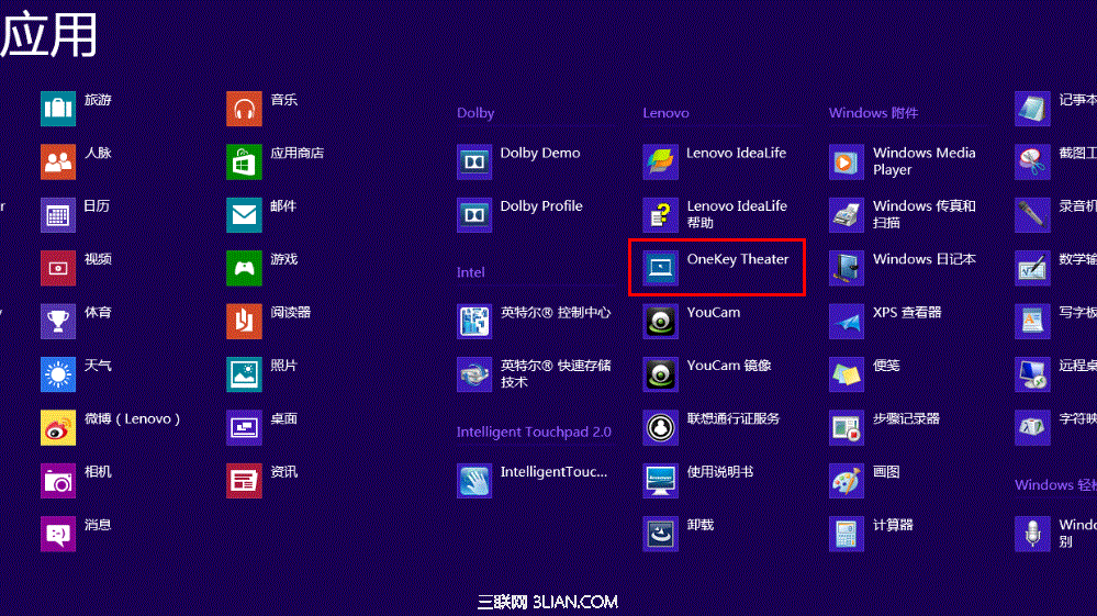 若上面的菜單中沒有,可以在“開始”菜單中點擊“鼠標右鍵”顯示“所有應用”點擊“OneKey Theater”