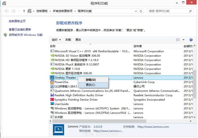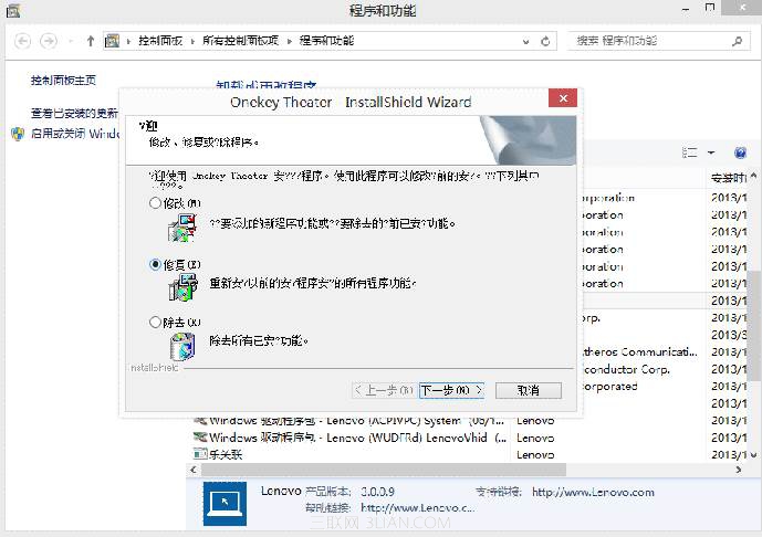 在Metro界面中找不到一鍵影音圖標,可在“控制面板”中“修復”“OneKey Theater”來解決,如下圖: