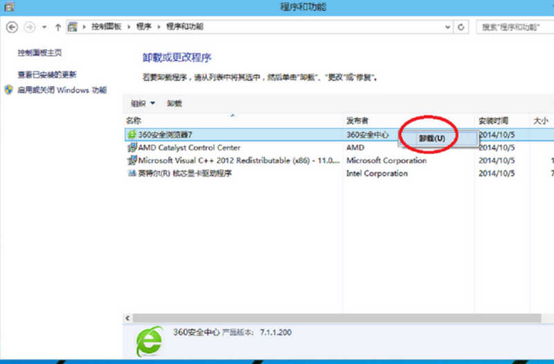 在卸載程序窗口,找到你需要卸載的程序軟件,比如360安全衛(wèi)士,在上面右擊--卸載,單擊卸載即可。