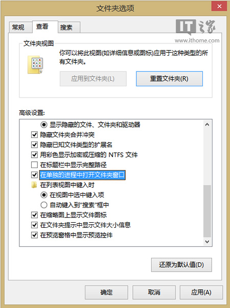 2、在文件夾選項(xiàng)中切換至“查看”選項(xiàng)卡,勾選“始終顯示圖標(biāo),從不顯示縮略圖”以及“在單獨(dú)的進(jìn)程中打開文件夾窗口”。保存并退出。