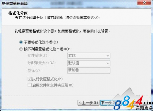 在“格式化分區”對話框中,執行下列操作之一:如果您不想立即格式化該卷,請單擊“不要格式化這個卷”,然后單擊“下一步”。