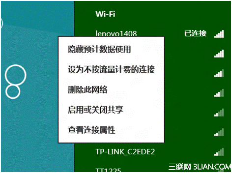 3、右擊選擇已連接好的無線信號,跳出的選項有 “顯示和隱藏預計數據使用”“設為按流量計費的連接”;