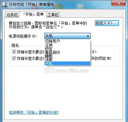 用鼠標右鍵點擊“開始”按鈕,打開“屬性”,切換到“開始菜單”選項卡,在“電源按鈕操作”右側的下拉菜單中選擇“休眠”。