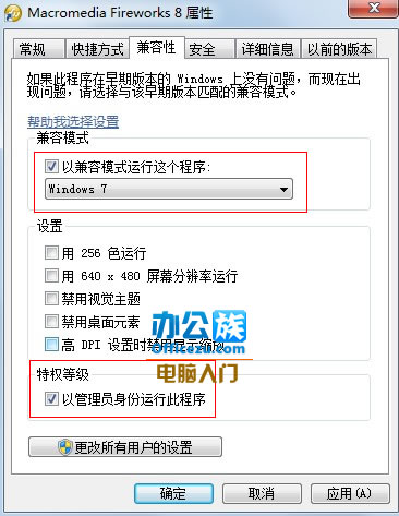 4、先勾選以兼容模式運行這個程序,然后選擇Windows7,在特權等級里面勾選以管理員身份運行此程序。