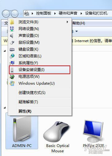 點擊Win7桌面左下角的圓形開始按鈕,打開“設備和打印機”。右鍵點擊PC圖標,選從右鍵菜單中選擇“設備安裝設置”。在彈出來的“設備安裝設置”窗口中選擇“否,讓我選擇...