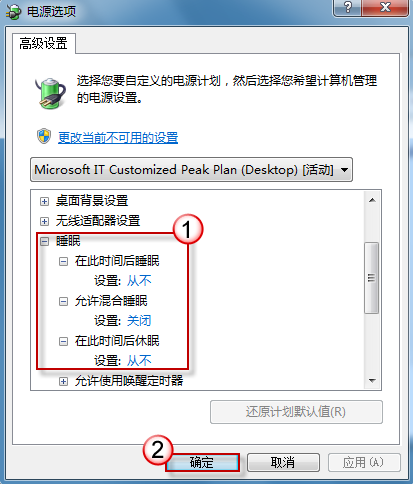 找到并展開“睡眠”項,將“睡眠”、“休眠”設定為“從不”。最后按“確定”保存所作的修改。