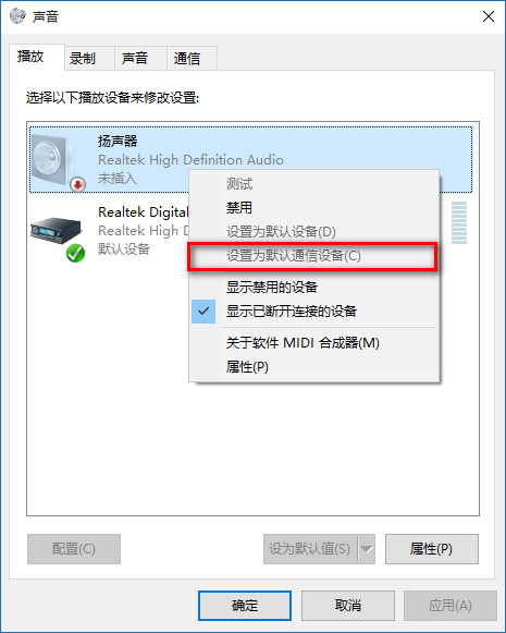 ▲選擇合適的設(shè)備作為默認(rèn)通信設(shè)備(此處作為演示,演示設(shè)備未使用VIA聲卡)設(shè)置好默認(rèn)通信設(shè)備后,再打開設(shè)備屬性(上圖右鍵菜單):