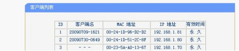 選擇客戶端列表就可以顯示出當前通過路由器連接的本地網絡的主機的名稱。客戶端主機的MAC地址,和分配給他們的IP地址,和其剩余的IP地址的使用時間。因為DHCP服務器涉及到一些專業的計算機知識,就不詳細的解釋,不過這個功能是非常的有用可以省去了設置IP協議的麻煩。