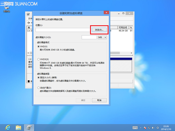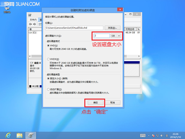 當指定好VHD保存位置以后,我們將為其設置大小,可參考下圖進行設置,當設置好后,點擊“確定”。