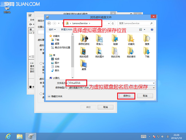 首先,指定一個虛擬磁盤文件的保存位置。可參考下圖,選定好保存位置之后,請對虛擬磁盤文件命名,設置好后點擊“保存”;