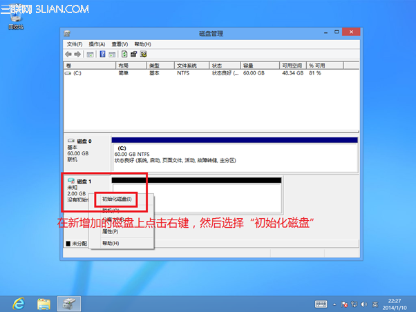 當虛擬磁盤創建好后,我們需要為其進行初始化操作,如下圖,在“磁盤1”上點擊鼠標右鍵,選擇“初始化磁盤”;