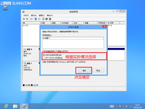 選擇后會打開初始化磁盤的窗口,磁盤分區形式MBR和GPT請根據實際情況自行選擇,選擇好后點擊“確定”;