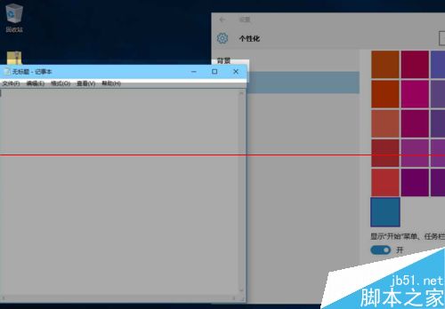 5、這時,切換到第一步驟中打開的“記事本應用,發現它的標題欄已經是彩色的了。這說明,第 4 步驟中的開關,不但對“開始菜單、任務欄和操作中心的顏色有影響,而且可以影響應用窗口標題欄的顏色。