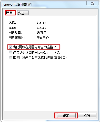 3、點擊鏈接,勾選或取消【當此網絡在范圍內時自動連接】的對勾,點擊確定。
