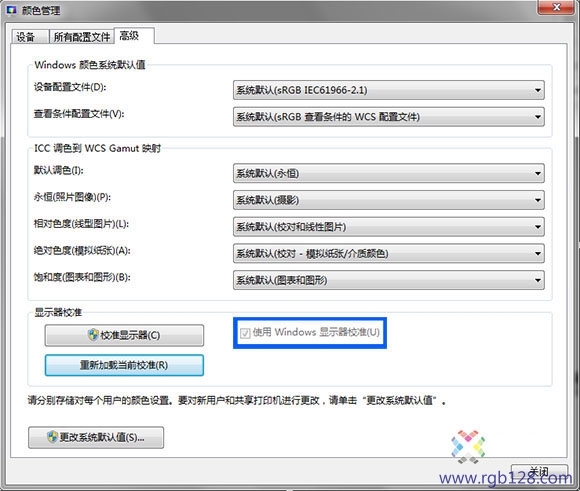 你會發現【使用Windows顯示器校準】(圖中藍色位置)那個復選框沒被勾選起來并且還是不能選擇狀態。其實你只要讓它能被勾起來,就可以讓windows 7自動加載你的icc文件并更改顯卡LUT至校色后的對應值了。