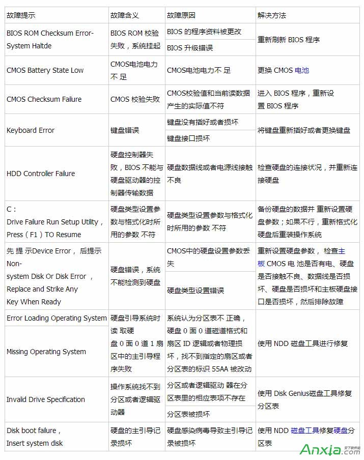 在解決開機報錯故障時,可以根據(jù)顯示屏上的錯誤提示判斷故障原因,再使用相應(yīng)的方法排除故障。下表為故障提示與解決方法的對照表。