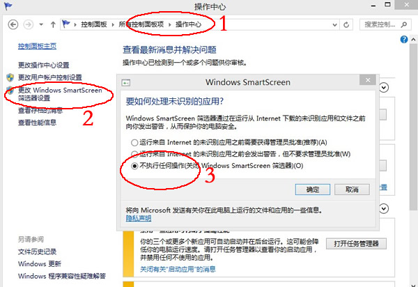 按Win+X組合鍵---控制面板---操作中心---更改Windows SmartScreen篩選器設置---不執(zhí)行任何操作---確定。如下圖: