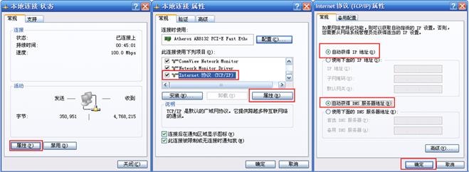 雙擊電腦桌面右下角的本地連接"小電腦"圖標(biāo)(若電腦右下角沒有網(wǎng)卡圖標(biāo),進(jìn)入方法為"開始--控制面板--網(wǎng)絡(luò)連接--雙擊本地連接"),然后按照下圖進(jìn)行配置即可。