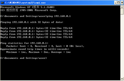 選擇自動獲得IP地址。點擊確定待本地連接顯示已連接上以后,打開命令提示符,輸入命令ping 192.168.0.1,回車。若出現如下界面,則說明和路由器已經連通。