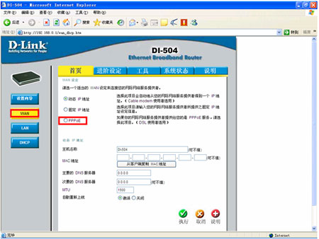 點擊確定后,進入DI-504配置界面,單擊左側WAN按鈕。