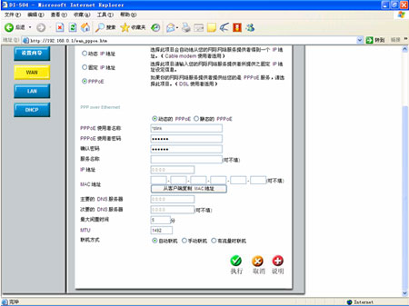 點選PPPoE,然后在下面的界面中填寫ISP提供給您的用戶名和密碼,密碼填兩遍。然后點擊執行。