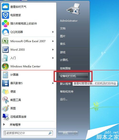 1、點擊開始按鈕,打開“設備和打印機”菜單。