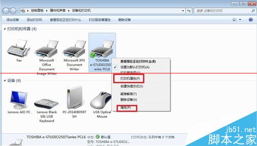 2、這時候會出現顯示你所使用電腦上連接的所有設備和打印機,找到你電腦連接的打印機,右擊,選擇“打印機屬性”(或者“屬性”,根據打印機不同,略有差別)