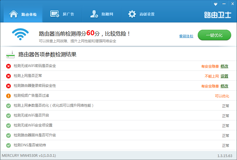 點擊“一鍵優(yōu)化”,可以自動開啟屏廣告功能,優(yōu)化網(wǎng)絡(luò)性能,檢測DNS健康狀況以及路由器是否有新的固件更新來提高路由器的穩(wěn)定性。