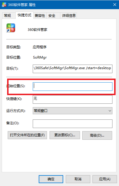 3、在屬性對(duì)話框中的“目標(biāo)”及“起始位置”里的路徑還是老的,里面有個(gè)文件名被改掉了。找到被改掉的那個(gè)文件名改成現(xiàn)在的,點(diǎn)擊確定即可。
