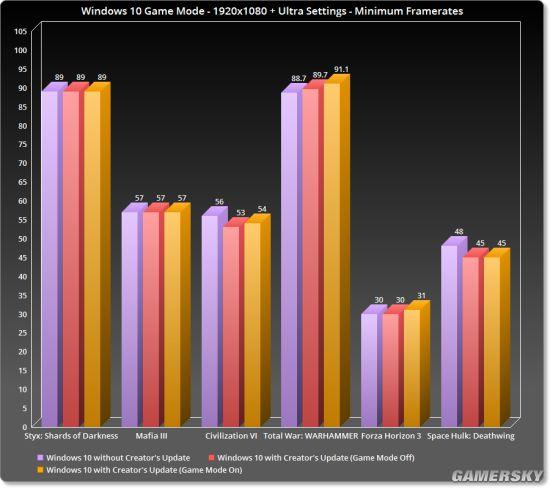 紫條:未進行創意者更新的Win 10,紅條:更新后(游戲模式關閉),黃條:更新后開啟游戲模式