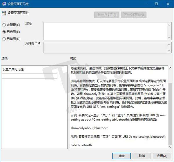 示例:若要指定只隱藏“藍牙”頁面(其URI為ms-settings:bluetooth):