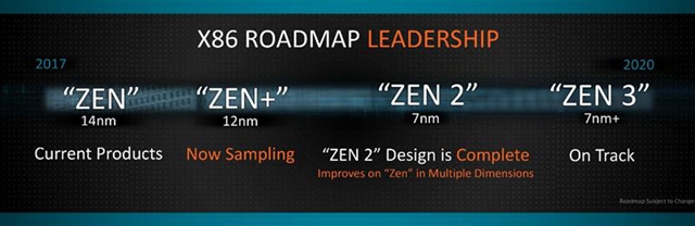 2019年是7nm Zen 2,直接跨越10nm工藝而進入下一個節點,同時整個架構全面升級,躍升一個檔次,現已順利試產。