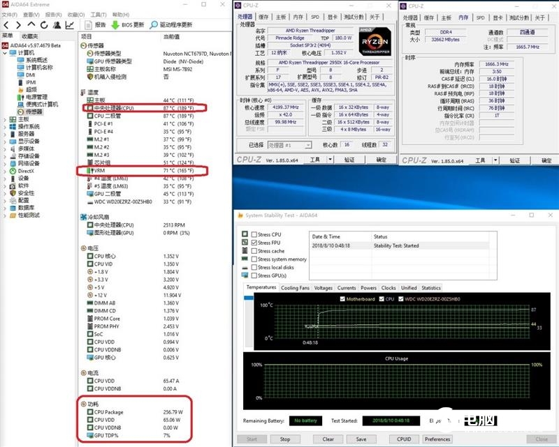 我們測試平臺使用的是微星MEG X399 CREATION主板,擁有19相供電。規(guī)格如此強大的主板MOSFET溫度都能達到105度。