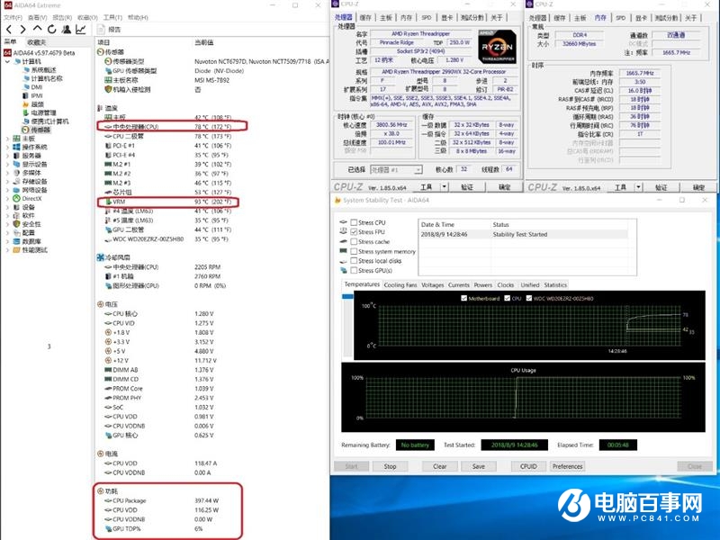 將2990WX超頻到1.28V 3.8GHz時候,使用水冷散熱。運行AIDA64 FPU 5分鐘,此時CPU核心功耗達到了400W,CPU溫度為78度,主板供電MOSFET溫度為91度,仍在可控范圍之內(nèi)。