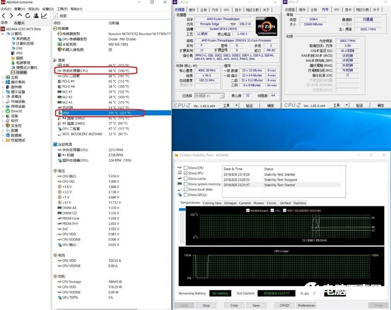 將2990WX超頻到1.41V 4.2GHz時候,使用水冷散熱。運行AIDA64 FPU 10分鐘后,CPU及主板各項溫度值趨于穩(wěn)定。此時CPU核心功耗達到了的480W,CPU溫度為88度,主板供電MOSFET溫度為105度。