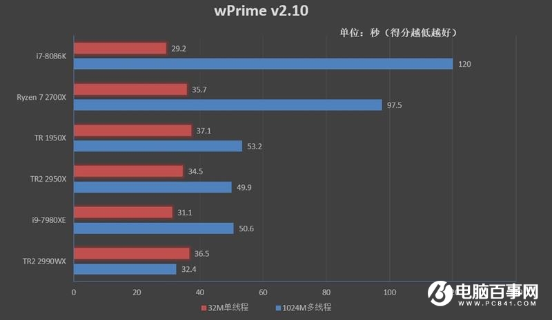 在wPrime 32M單線程性能測試中,2990WX耗時36.5秒,比7980XE慢了5.4秒。