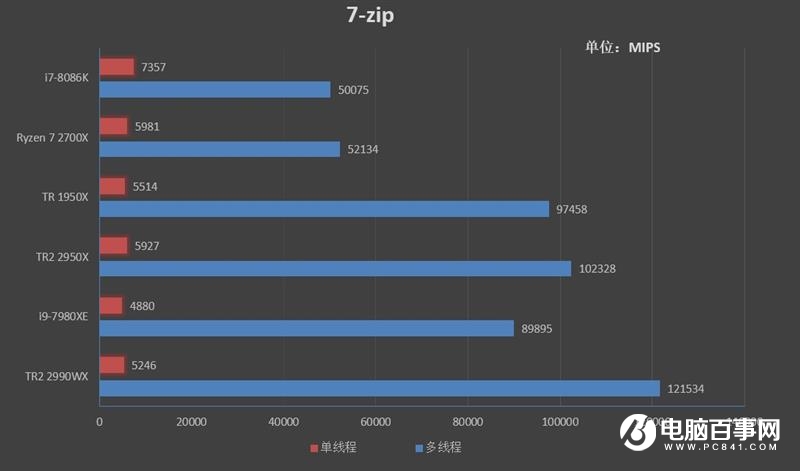 在7-zip測試中。2990WX以121534MIPS的成績領先7980XE 35%,2950X同樣也比7980XE要強12%。