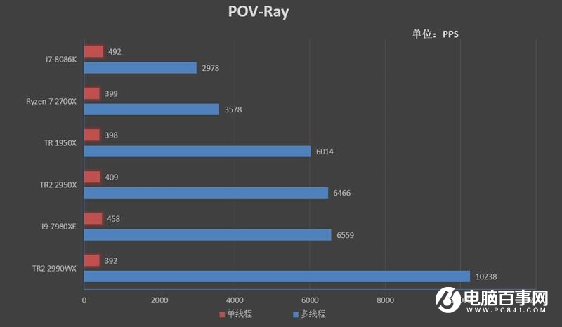 在POV-Ray測試中,2990WX以10239PPS的成績領先群雄。
