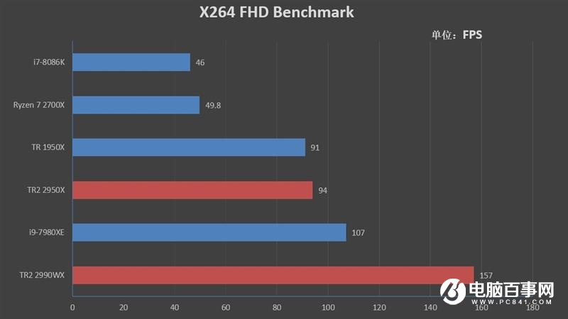 在X264測試中,2990WX以157的FPS領先7980XE 46%,2950X也比1950X快了3幀。