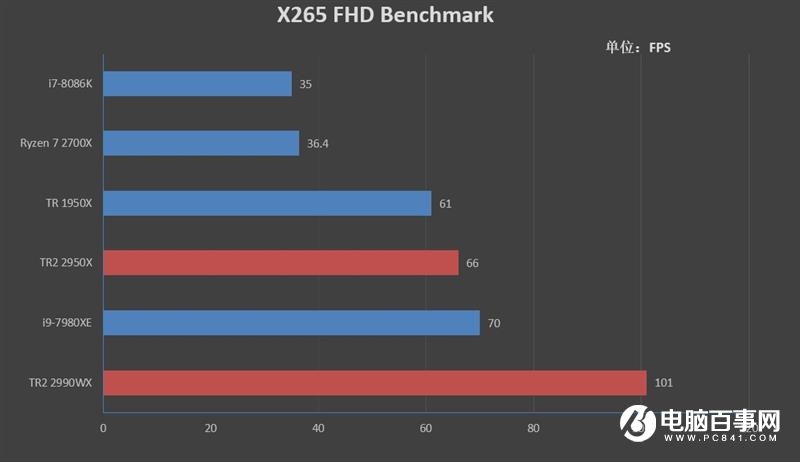 在X265 FHD Benchmark中,2990WX跑出了101幀的成績,相比7980XE提升了31幀,領先幅度為45%。
