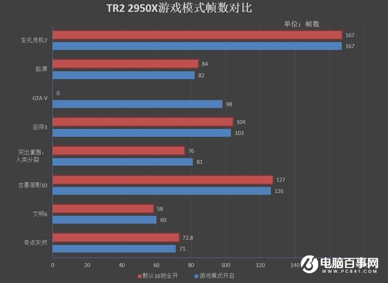在2950X平臺測試的8款游戲中,全核模式下只有《GTA 5》會提示線程錯誤而無法開始游戲;其他7款游戲在開啟游戲模式后,只有《文明6》、《突出重圍:人類分裂》獲得了幀數(shù)小幅度提升,剩下的5款游戲在16核全開時幀數(shù)比游戲模式更高。