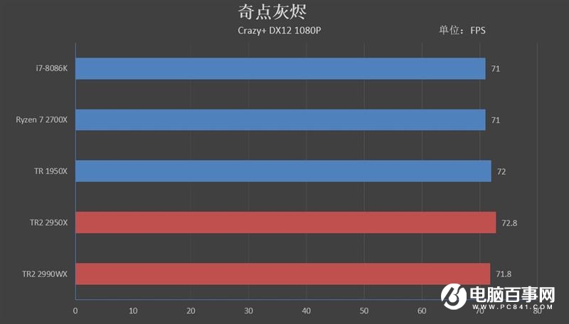上面5款CPU的成績都很接近,2950X首次拔得頭籌,達到了72.8幀,2990WX以71.8幀位居第二。
