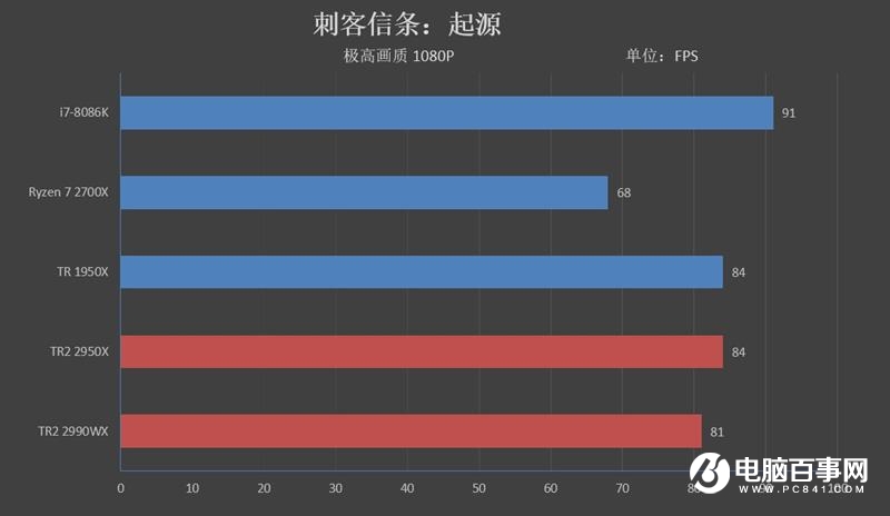 TR4平臺表現最好的是1950X核2950X,2款CPU都能達到84幀。