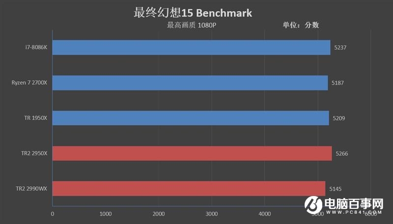 《最終幻想15》是一款較為依賴顯卡性能的游戲,以上5款處理器表現基本一致,沒有太大差別,其中2950X成績略微領先其他四款處理器。