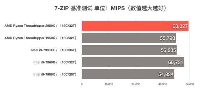 在7-ZIP的多核基準測試當(dāng)中,線程撕裂者2950X跑出了63327MIPS的分數(shù),對比上一代1950X的55793MIPS有顯著提升,而對比7900X的54834MIPS、7960X的60731MIPS、7980XE的56285MIPS都有不同程度的領(lǐng)先優(yōu)勢,再次驗證了對多核支持好的軟件通常對于AMD產(chǎn)品更友好。