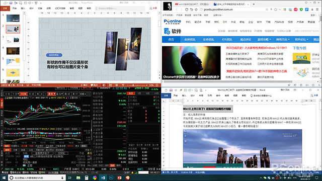 Win7時代就已經引入的分屏,在Win10時代進行了升級。通過將窗口拖拽到屏幕兩側或四個邊角,即可快速實現當前窗口的1/2分屏及1/4分屏。Win10允許用戶根據環境組合窗口,也就是說左側兩個1/4窗口,右側一個1/2窗口也是可以實現的。如果你的顯示器是2K或4K等超高分辨率的話,那么這項功能將黑白常實用的。