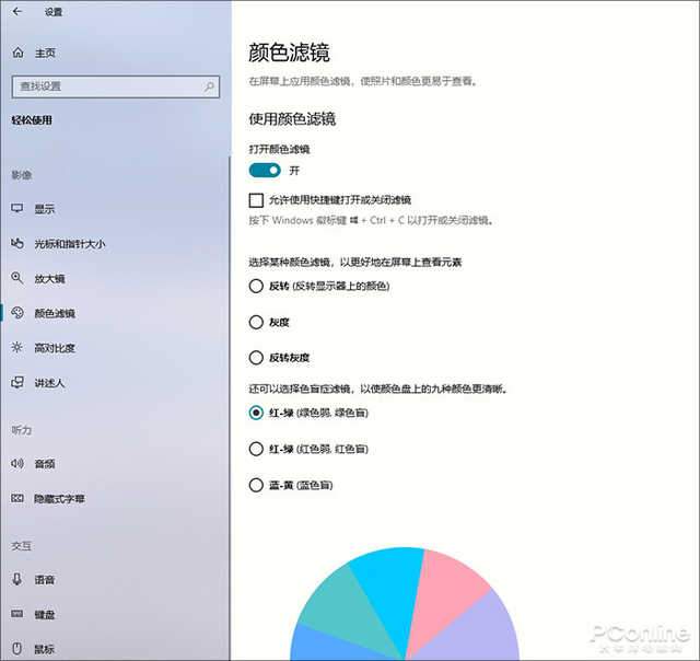 Win10內(nèi)嵌了一項專為色盲色弱用戶打造的“顏色濾鏡”。通俗點兒說,是通過提高某組顏色在整個畫面中的色彩比例,來幫助色盲或色弱者還原正確的視覺。你只要首先告訴計算機你的色彩障礙傾向(如紅弱、綠弱、藍弱等,親……全色盲很少滴~),Win10就會自動完成校準(zhǔn)。需要注意的是,校準(zhǔn)結(jié)果會自動應(yīng)用于所有場合,如文檔、網(wǎng)頁、視頻、游戲,非常非常實用。