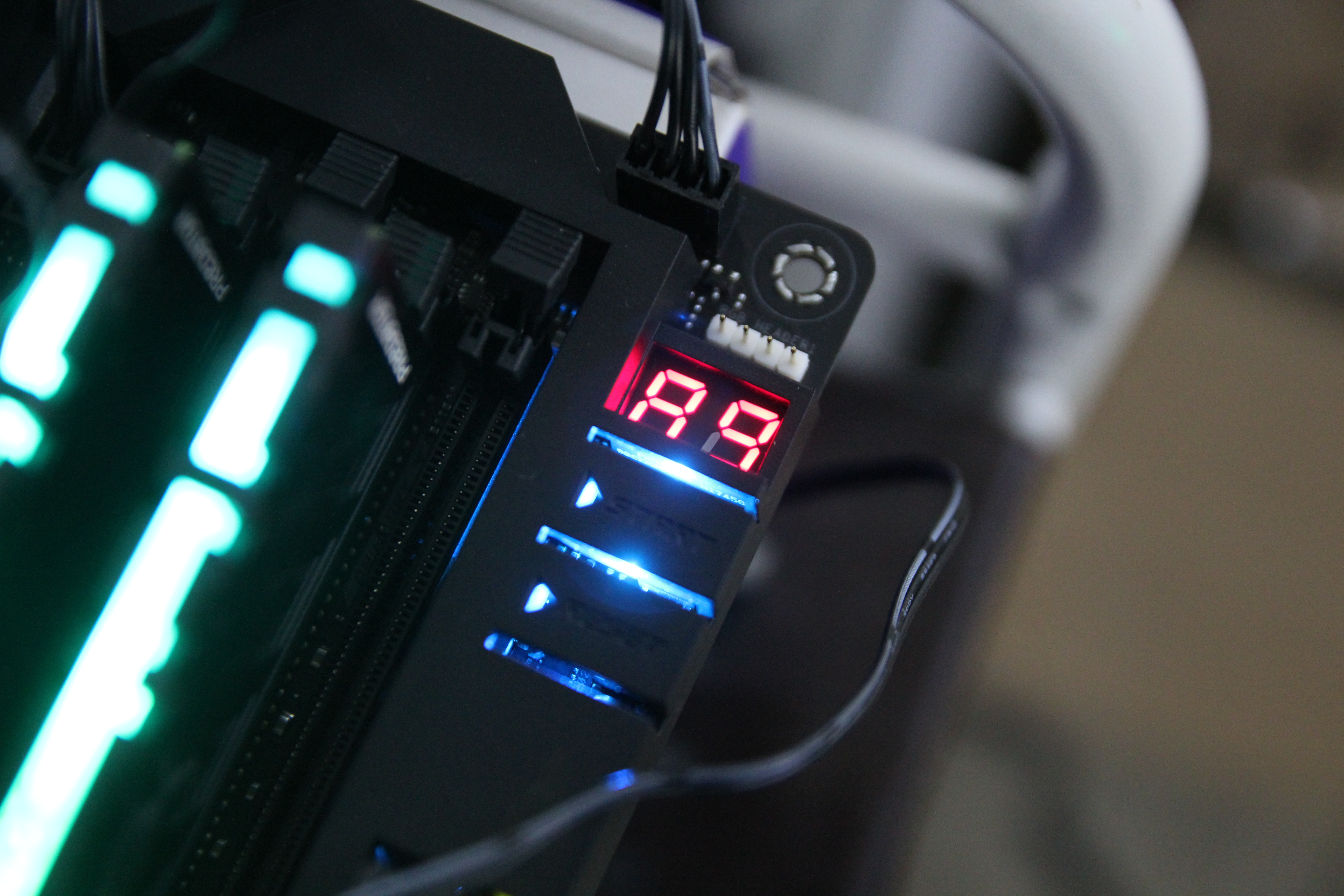 作為ROG旗下旗艦級別的電競主板產(chǎn)品,M11F主板自然不能缺少炫目的RGB光效,在主板I/O裝甲面板上的MAXIMUS XI銘牌上、主板上的開機(jī)重啟鍵以及主板正面ABS裝甲上,均有RGB燈效的存在,配合主板PCIe裝甲上巨大“敗家之眼”,有著極高的顏值。