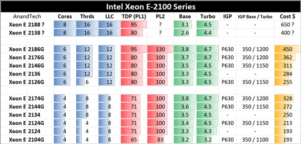 Anandtech的猜測是,ES1預計命名Xeon E-2138,ES2預計命名Xeon E-2188,價格分別是400美元和650美元左右。